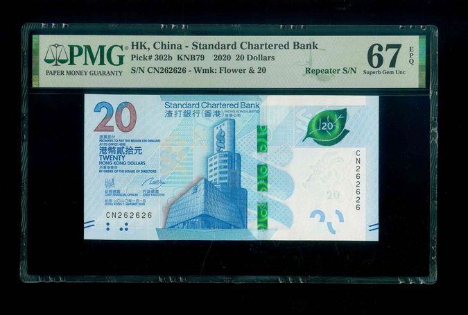 2020 香港渣打銀行 $20 PMG 67 EPQ 編號:CN262626(重複號,頂級雪白)