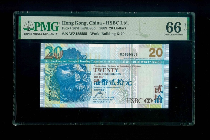 2009 香港上海滙豐銀行 $20 PMG 66 EPQ 編號:WZ155555(老虎號)