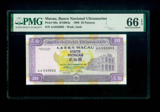 1996 澳門大西洋銀行 20 Patacas PMG 66 EPQ 編號:AA045962(頭版系列,頂級雪白)