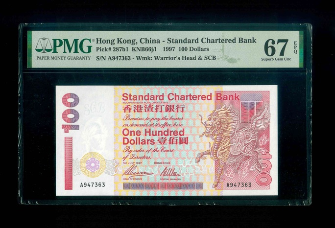 1997 香港渣打銀行 $100 PMG 67 EPQ 編號:A947363(頂級雪白)