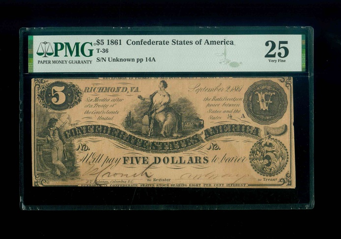1861 美國 $5 (內戰期間發行) PMG 25 編號:14A(Stained, Tears)