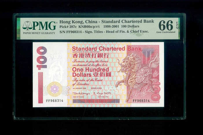 1999 香港渣打銀行 $100 PMG 66 EPQ 編號:FF968314(頂級雪白)