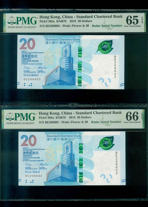 2018 香港渣打銀行 $20 PMG 65-66 EPQ 編號:BD/BE 206602(共2張,雷達同號,頂級雪白)