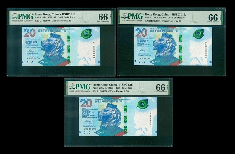 2018 香港上海滙豐銀行 $20 PMG 66 EPQ 編號:CU/CT/DE 930000(共3張,獅子同號,頂級雪白)