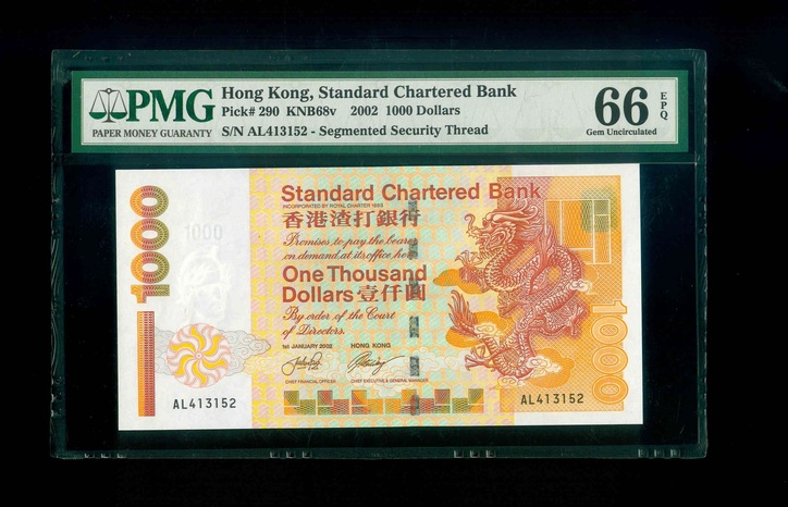 2002 香港渣打銀行 $1000 PMG 66 EPQ 編號:AL413152(頂級雪白)
