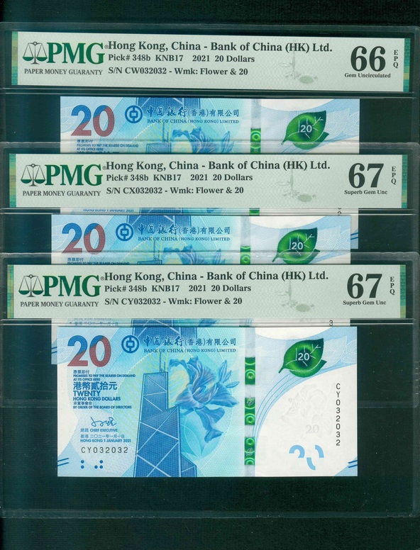 2021 香港中國銀行 $20 PMG 66-67 EPQ 編號:CW/CX/CY 032032(共3張,重複同號,頂級雪白)
