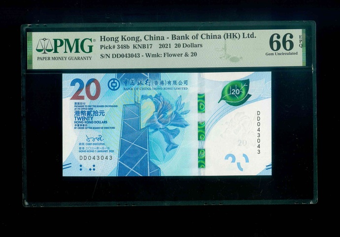 2021 香港中國銀行 $20 PMG 66 EPQ 編號:DD043043(雙冠重複號,頂級雪白)