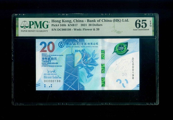 2021 香港中國銀行 $20 PMG 65 EPQ 編號:DC000198(頂級雪白)