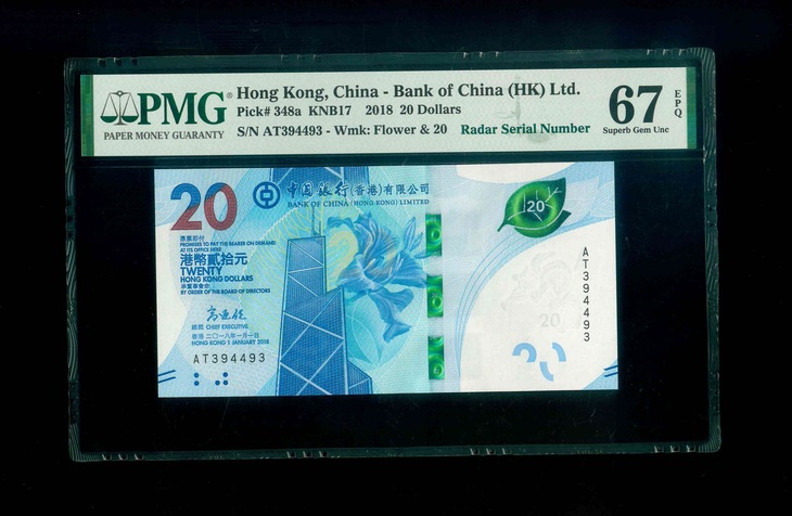 2018 香港中國銀行 $20 PMG 67 EPQ 編號:AT394493(雷達號,頂級雪白)