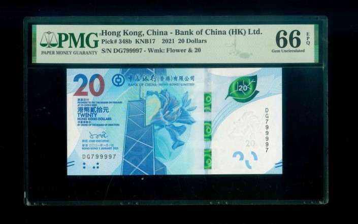 2021 香港中國銀行 $20 PMG 66 EPQ 編號:DG799997(雷達號,頂級雪白)