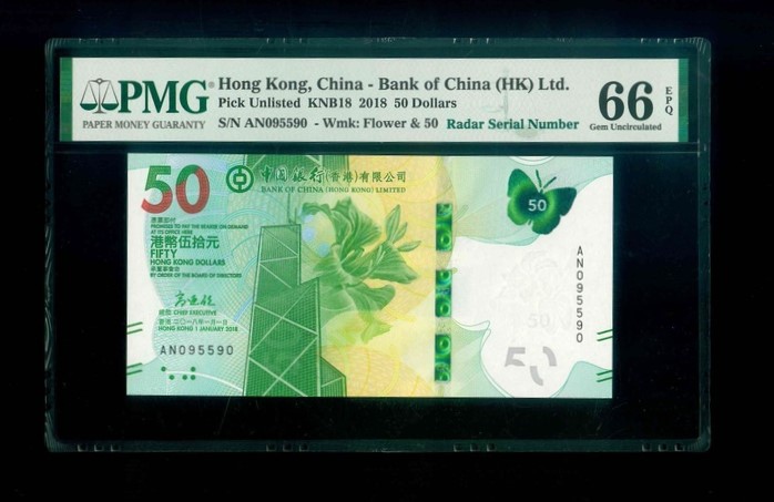 2018 香港中國銀行 $50 PMG 66 EPQ 編號:AN095590(雷達號,頂級雪白)