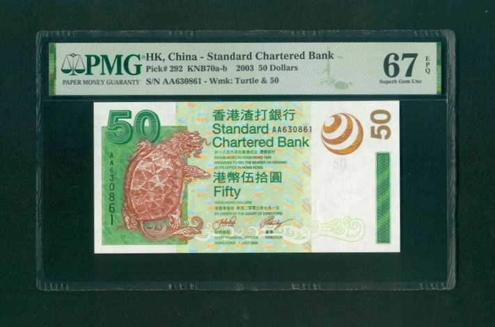 2003 香港渣打銀行 $50 PMG 67 EPQ 編號:AA630861(頭版系列,頂級雪白)