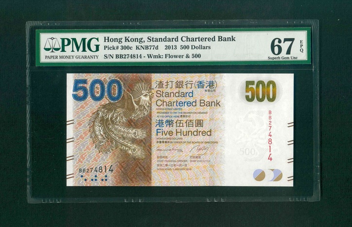 2013 香港渣打銀行 $500 PMG 67 EPQ 編號:BB274814(頂級雪白)