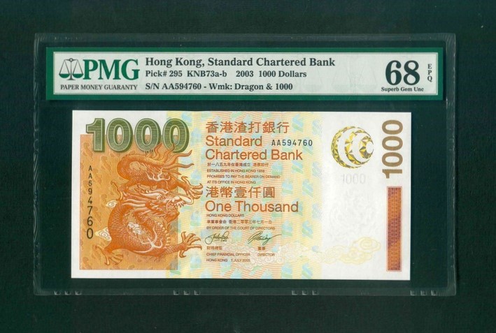 2003 香港渣打銀行 $1000 PMG 68 EPQ 編號:AA594760(頭版系列,頂級雪白)