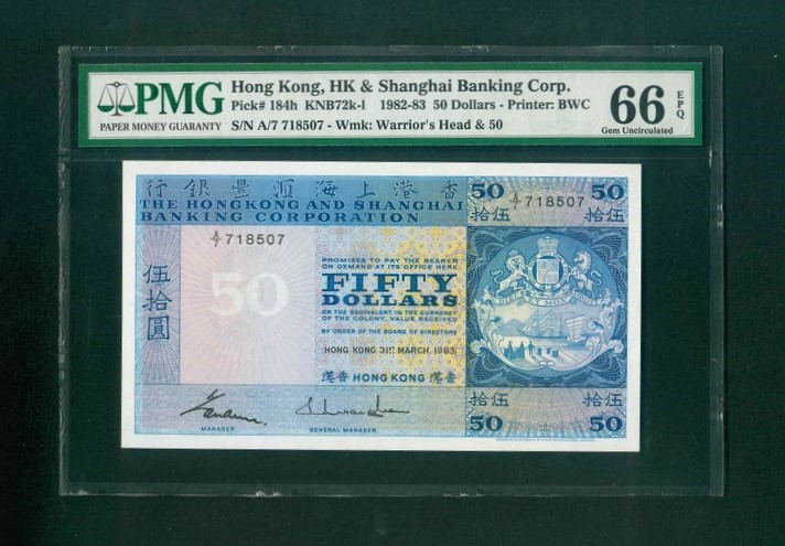 1983 香港上海滙豐銀行 $50 PMG 66 EPQ 編號:A/7 718507(頂級雪白)