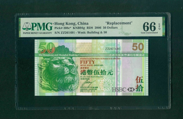 2006 香港上海滙豐銀行 $50 PMG 66 EPQ 編號:ZZ261491(補版系列,頂級雪白)