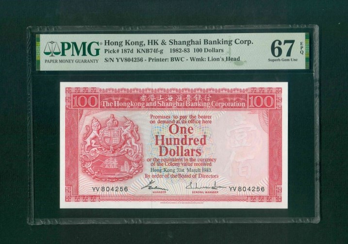 1983 香港上海滙豐銀行 $100 PMG 67 EPQ 編號:YV804256(頂級雪白)