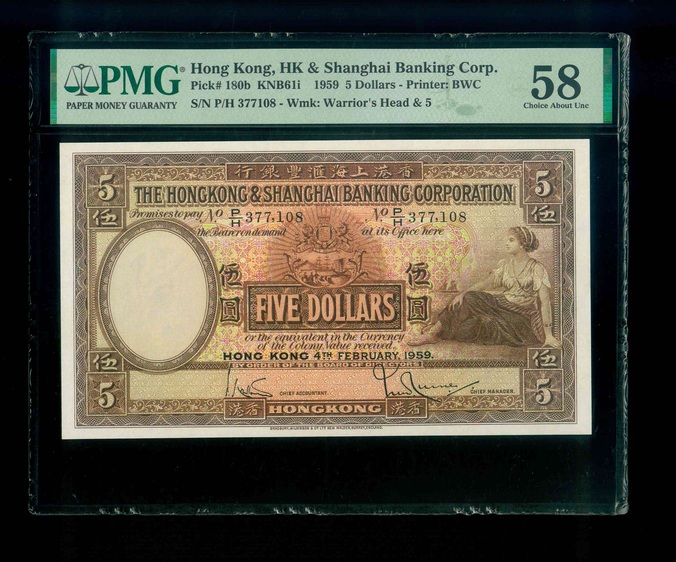 1959 香港上海滙豐銀行 $5 PMG 58 編號:P/H 377108