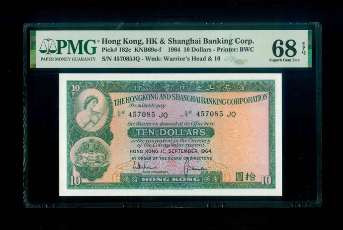 1964 香港上海滙豐銀行 $10 PMG 68 EPQ 編號:457085 JQ