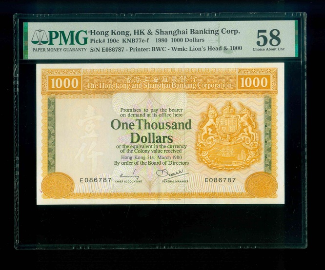 1980 香港上海滙豐銀行 $1000 PMG 58 編號:E086787