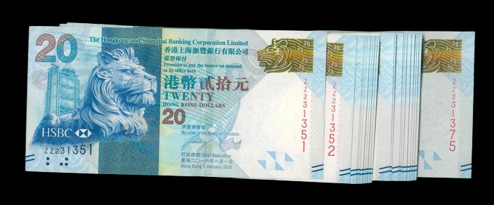 2016 香港上海滙豐銀行 $20 UNC 編號: ZZ231351-75(共25張.連號,頂級雪白)