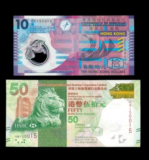 2018/2016 香港特區政府 $10/上海滙豐銀行 $50 UNC 編號: DE150015...(共2張,雷達同號,頂級雪白)