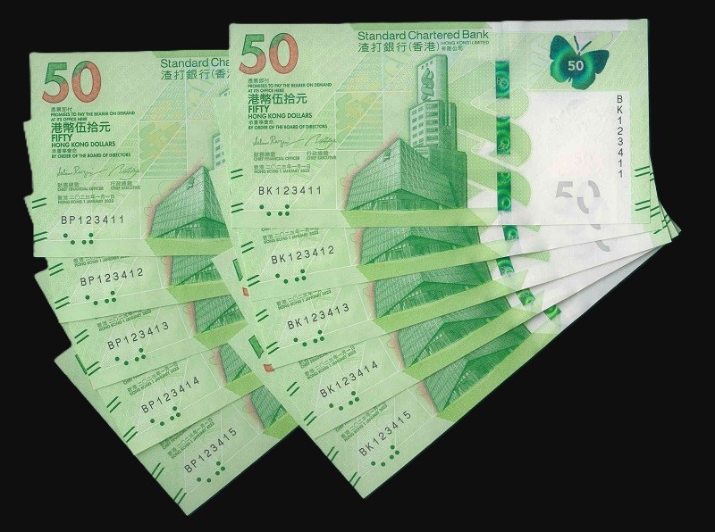 2023 香港渣打銀行 $50 UNC 編號: BK/BP 123411-15(共10張,5組各同號,頂級雪白)