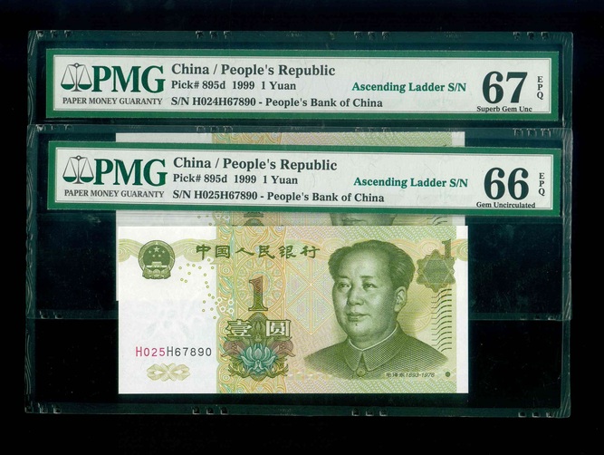 1999 中國人民銀行 $1 PMG 66-67 EPQ 編號:H024H67890…(共2張,頂級雪白,順蛇同號)