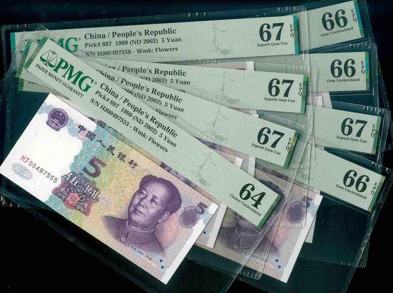 1999 中國人民銀行 $5 PMG 66-67 EPQ/PMG 64 編號:HJ00497555-62…(共8張,含連號/樣鈔)