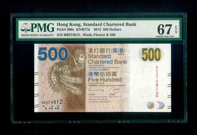 2013 香港渣打銀行 $500 PMG 67 EPQ 編號:BB274812(頂級雪白)