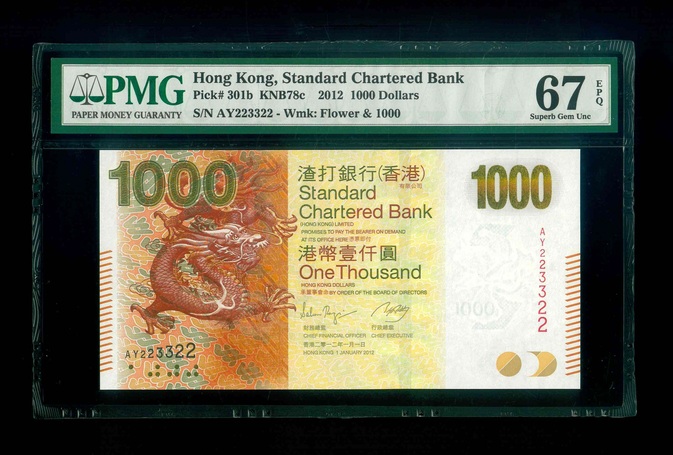 2012 香港渣打銀行 $1000 PMG 67 EPQ 編號:AY223322(三對子,頂級雪白)