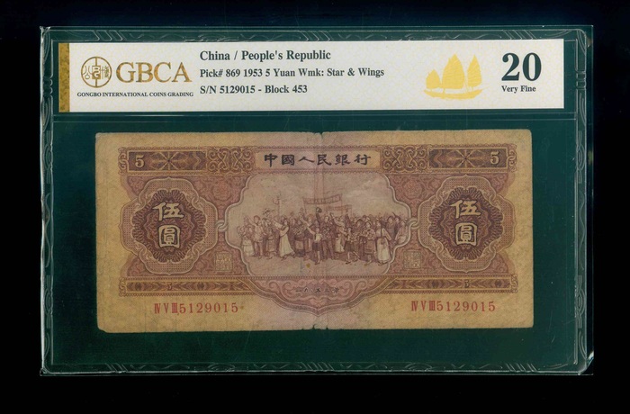 1953 中國人民銀行 伍圓 GBCA 20 編號:IV V III 5129015