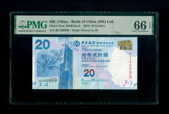2010 香港中國銀行 $20 PMG 66 EPQ 編號:BU599999(老虎號)