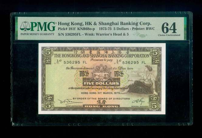 1975 香港上海滙豐銀行 $5 PMG 64 編號:536295 FL