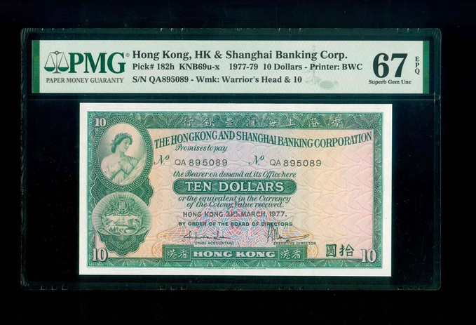 1977 香港上海滙豐銀行 $10 PMG 67 EPQ 編號:QA 895089(頂級雪白)