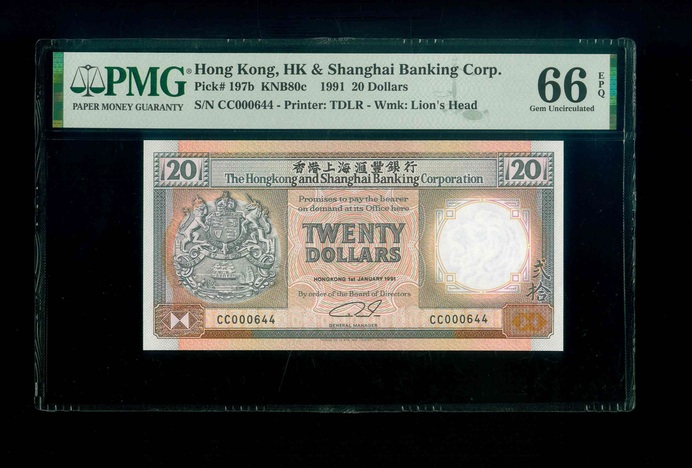 1991 香港上海滙豐銀行 $20 PMG 66 EPQ 編號:CC000644(頂級雪白)