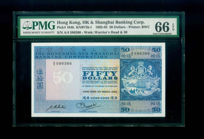 1982 香港上海滙豐銀行 $50 PMG 66 EPQ 編號:A/4 596366(頂級雪白)