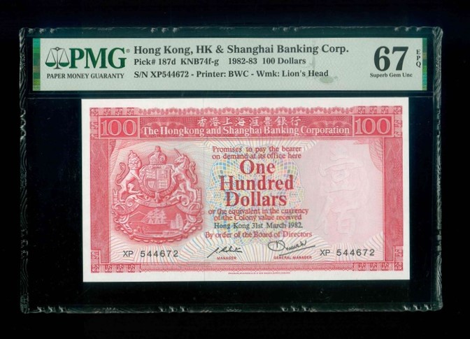 1982 香港上海滙豐銀行 $100 PMG 67 EPQ 編號:XP 544672(頂級雪白)
