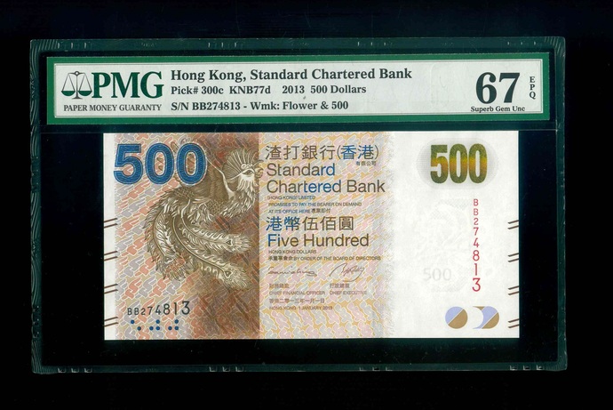 2013 香港渣打銀行 $500 PMG 67 EPQ 編號:BB274813(頂級雪白)