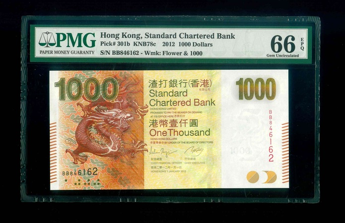 2012 香港渣打銀行 $1000 PMG 66 EPQ 編號:BB846162(頂級雪白)