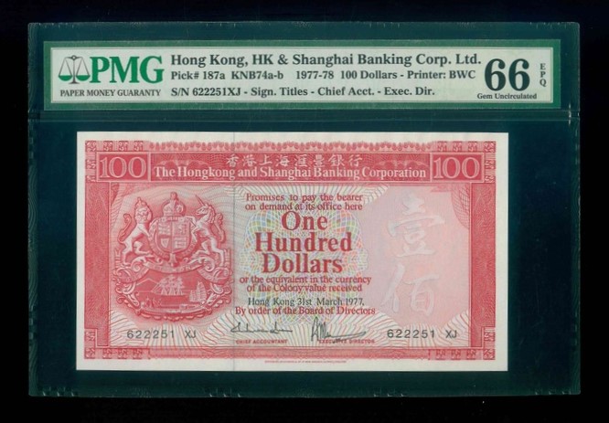 1977 香港上海滙豐銀行 $100 PMG 66 EPQ 編號:622251 XJ