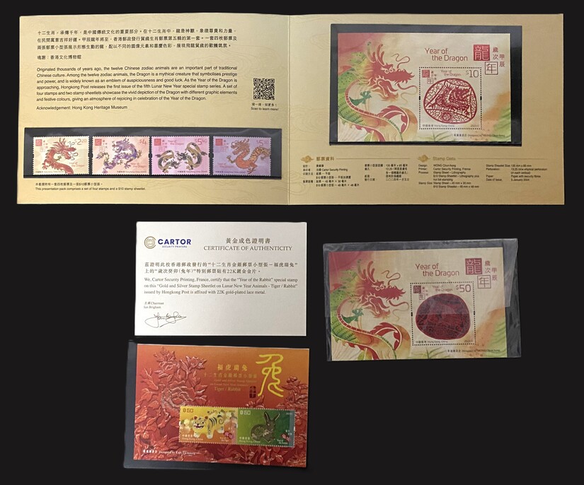 2023/2024 香港郵政龍年生肖郵票套摺 不同面值/ 小型張-龍,虎,兔 品相如圖 編號:NIL(共3全,含"兔"黃金成色證明書)