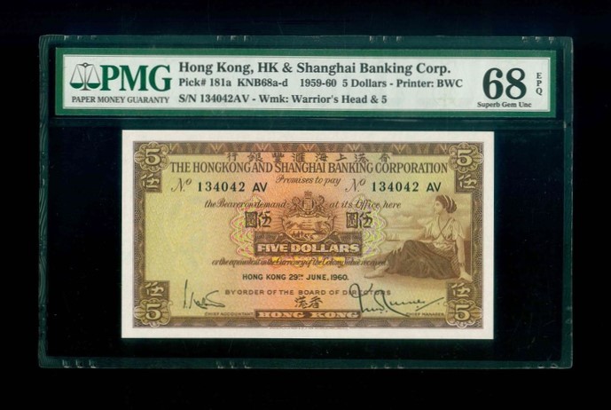 1960 香港上海滙豐銀行 $5 PMG 68 EPQ 編號:134042 AV(頂級雪白)