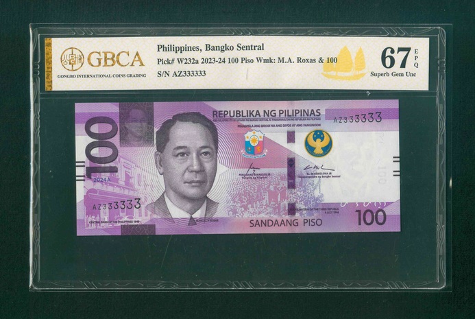 2024A 菲律賓 100 Piso GBCA 67 EPQ 編號: AZ333333(幸全3,頂級雪白)