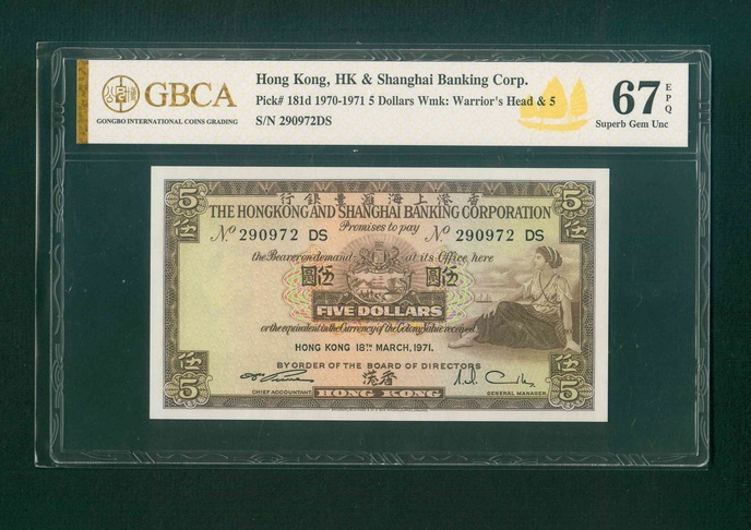 1971 香港上海滙豐銀行 $5 GBCA 67 EPQ 編號: 290972 DS(頂級雪白)