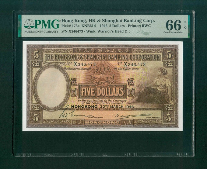 1946 香港上海滙豐銀行 $5 PMG 66 EPQ 編號: X346473(頂級雪白)