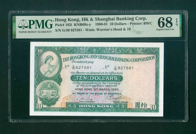1980 香港上海滙豐銀行 $10 PMG 68 EPQ 編號: G/36 827581(頂級雪白)