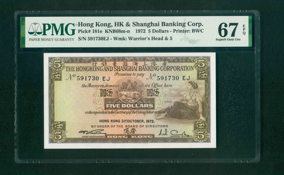 1975 香港上海匯豐銀行$5 PMG 67 EPQ 編號: 591730EJ(頂級雪白)