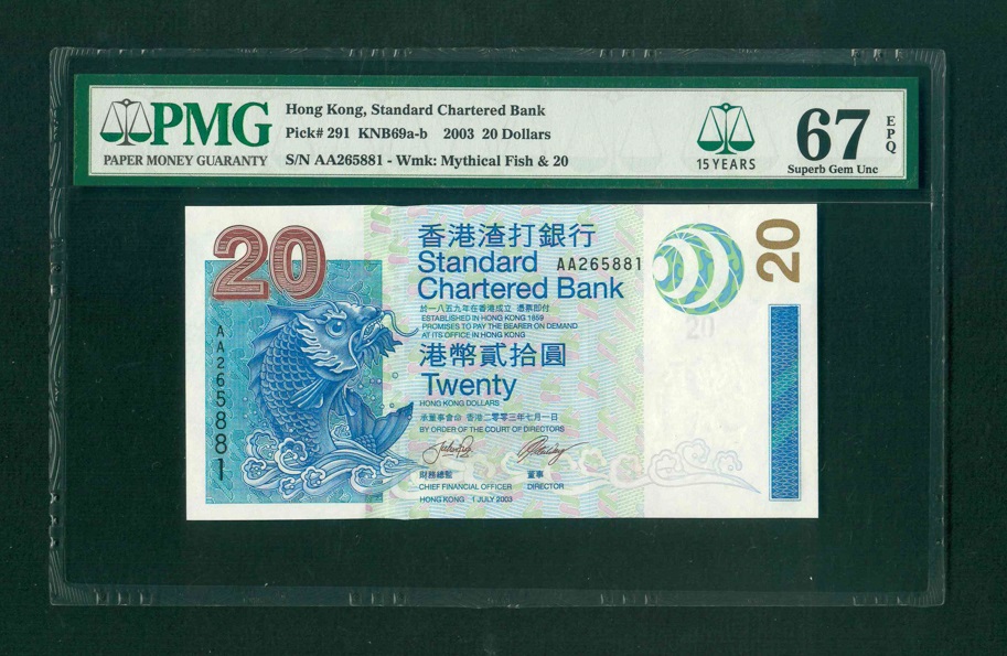 2003 香港渣打銀行$20 PMG 67 EPQ 編號: AA265811(頭版系列,頂級雪白)