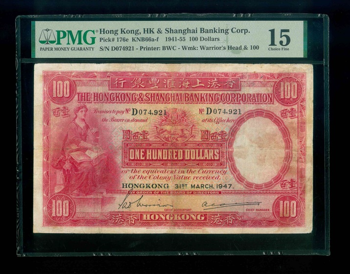 1947 香港上海滙豐銀行 $100 PMG 15 編號:D074921